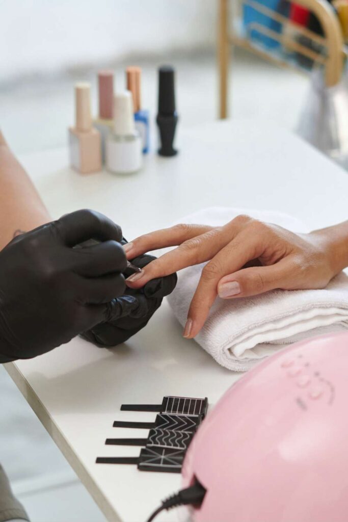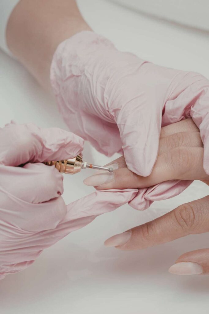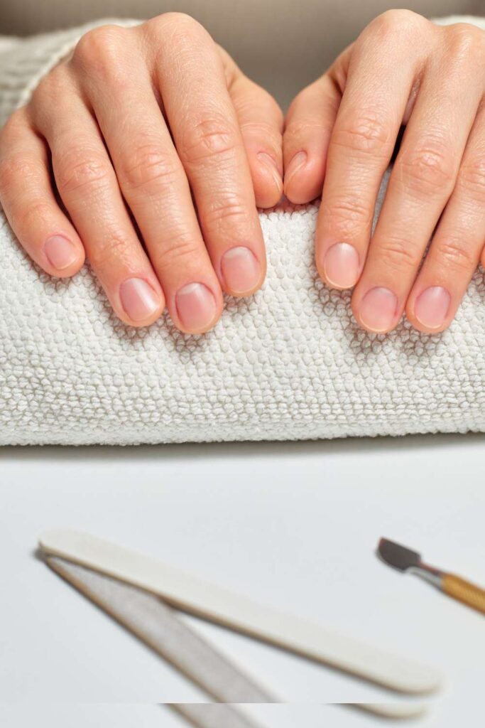 If you’re wearing glitter or darker colors, make sure everything is fully off. Your nails should look completely bare and clean before you move on.